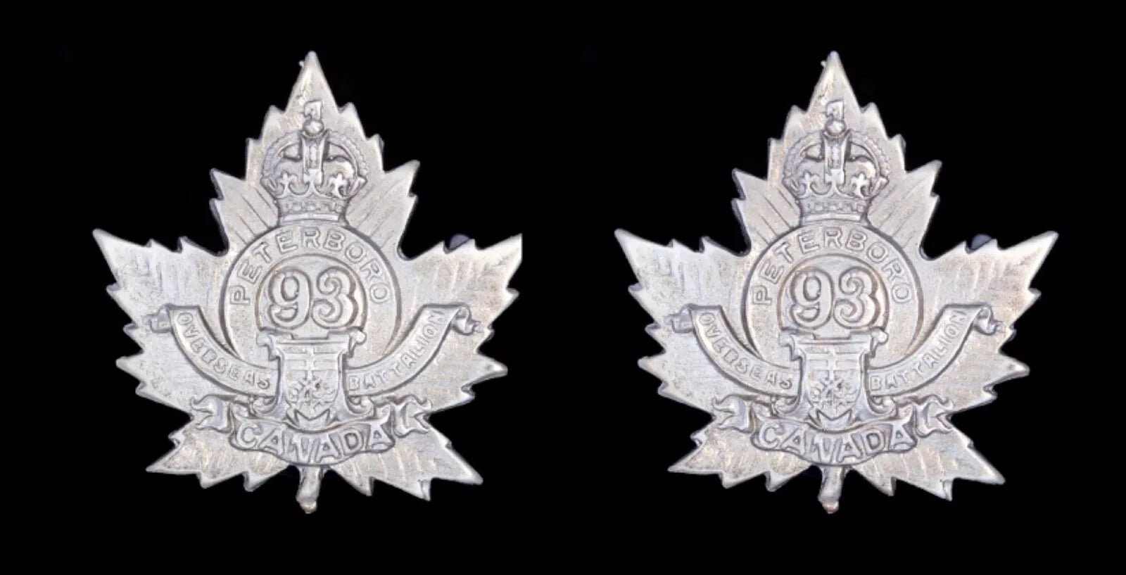 93rd Canadian Peterboro Battalion CEF Collar Badges Hallmarked Silver