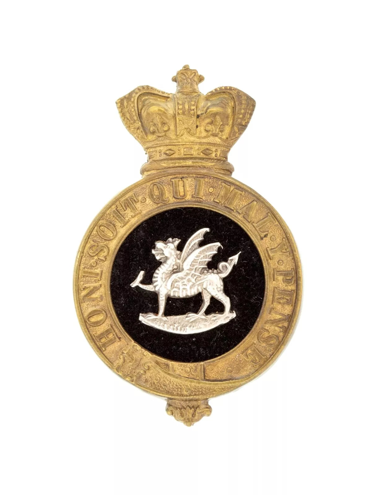 A strap inscribed HONI.SOIT.QUI.NAL.PENSE surmounted by a crown. In the centre on black velvet ground the dragoon in Silver.