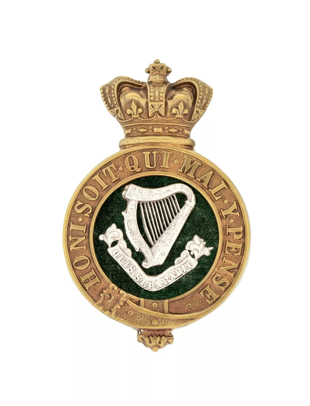 A strap inscribed HONI.SOIT.QUI.NAL.PENSE surmounted by a crown. In the centre on green velvet ground The harp with a scroll inscribed QUIS SEPARABIT a sprig of laurel issues from either end of the scroll.