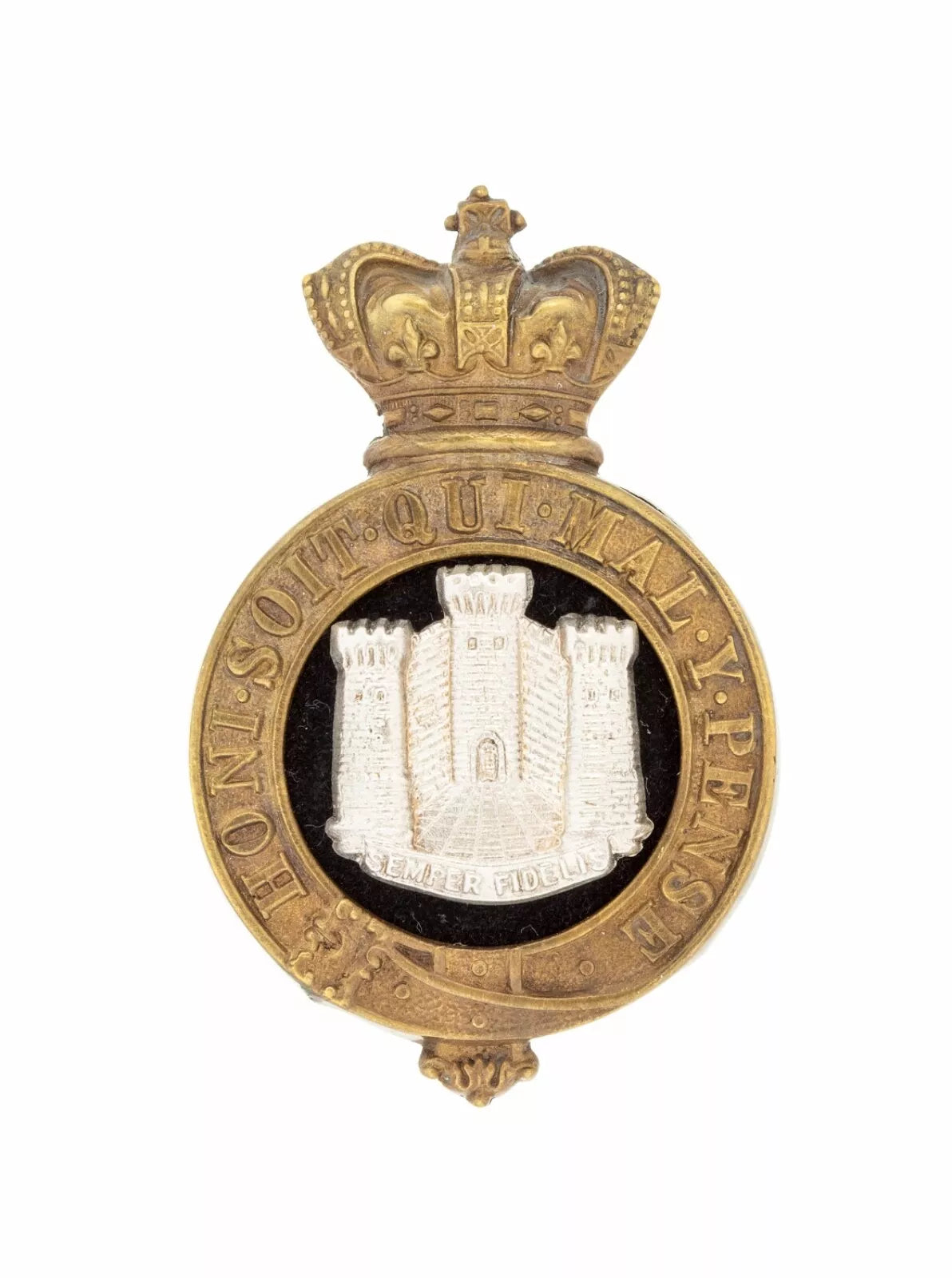 A strap inscribed HONI.SOIT.QUI.NAL.PENSE surmounted by a crown. In the centre on black velvet ground the castle of Exeter with scroll inscribed semper fidelis in Silver.