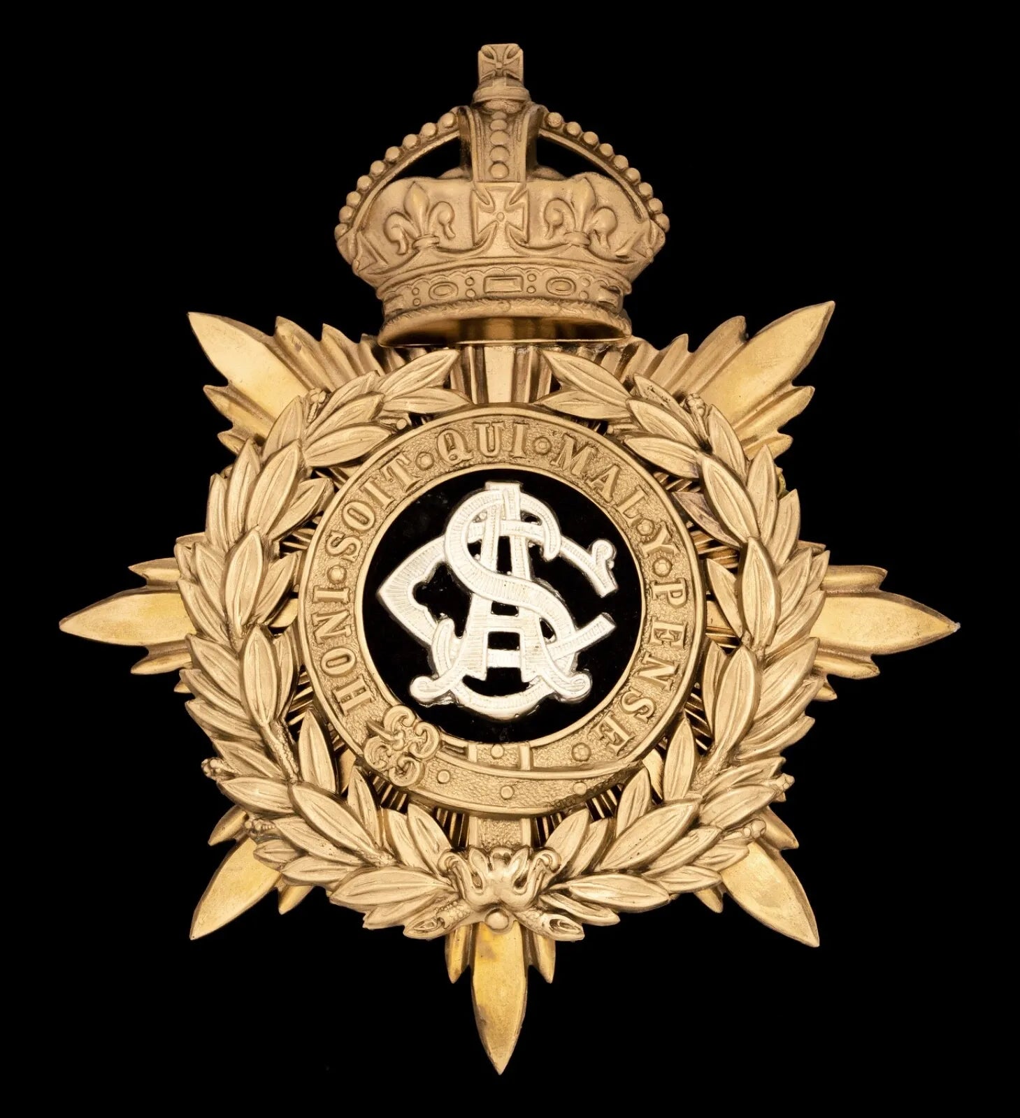 Surmounted by an imperial crown. In the centre on black velvet ground the letters ASC stands for Army Service Corps.