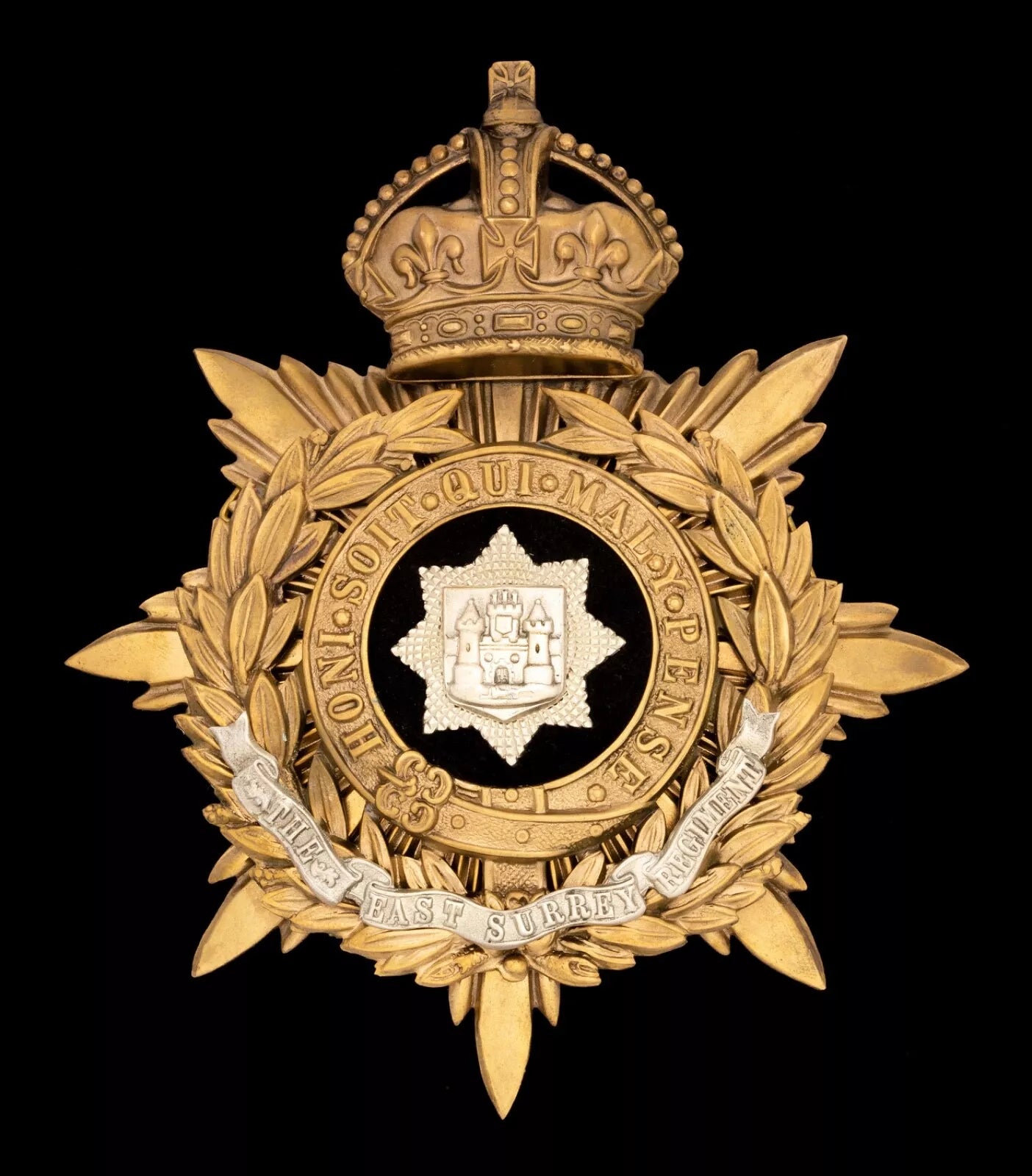 Surmounted by an Imperial Crown. In the centre on black velvet ground an eight-pointed star, on the arms of Guilford. Universal scroll The East Surrey Regiment.