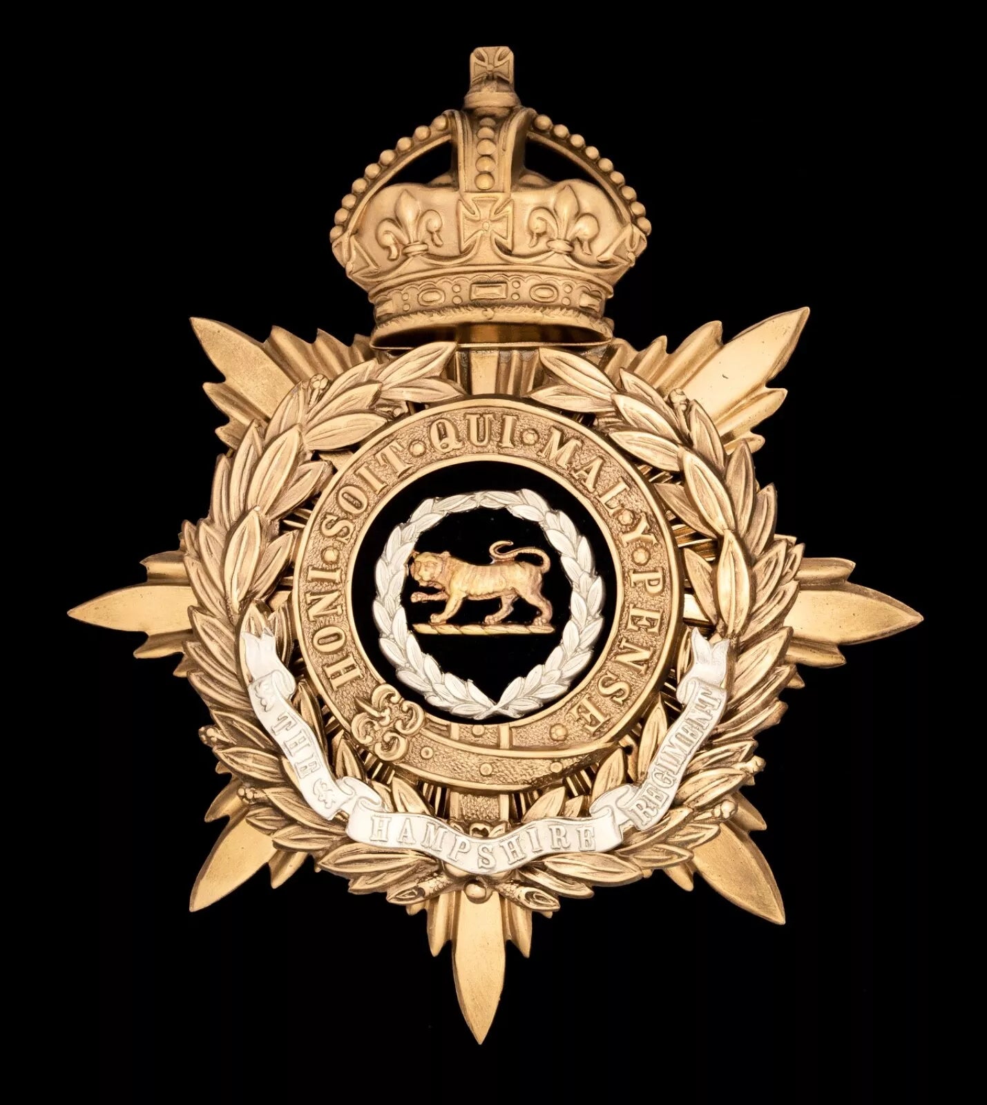 Surmounted by an Imperial Crown. In the centre on black velvet ground the tiger in gilt metal. Universal scroll The Hampshire Regiment.