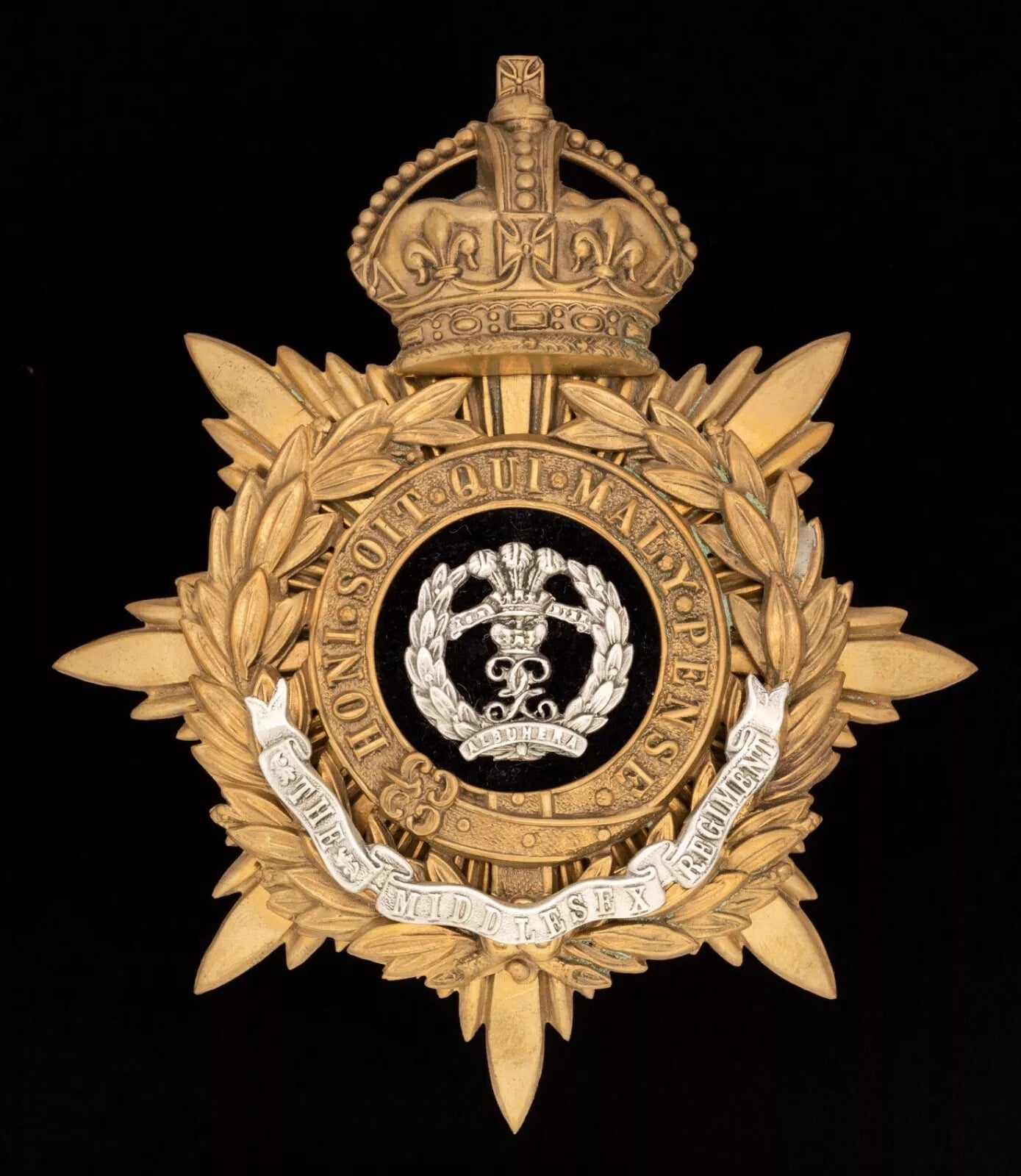 Surmounted by an Imperial Crown. In the centre on black velvet ground a laurel wreath within the Prince of Wales plume below a plume the coronet and cypher of H.R.H the Duke of Cambridge on the bottom of the wreath a scroll inscribed albuhera on the universal scroll the Middlesex Regiment.