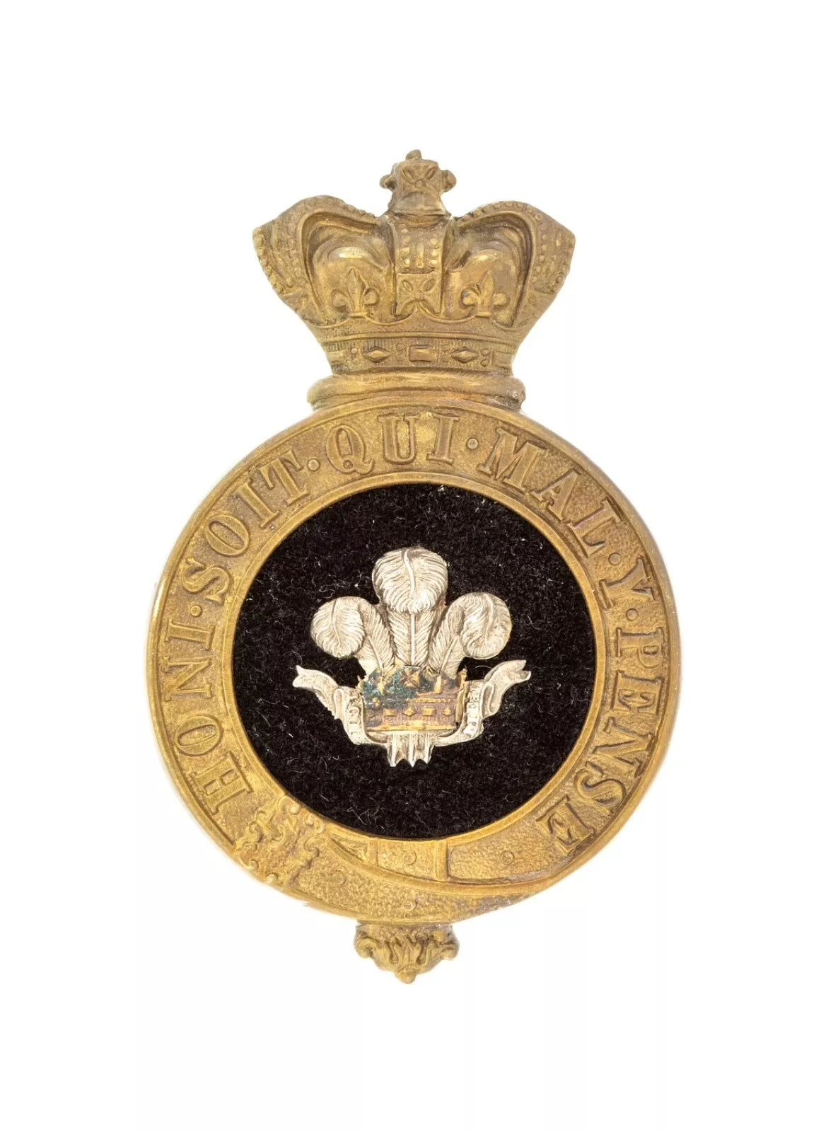 A strap inscribed HONI.SOIT.QUI.NAL.PENSE surmounted by a crown. In the centre on black velvet ground the prince of wales plume.