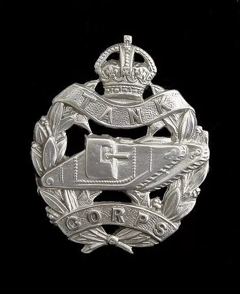A Tank within a laurel-wreath esigned with kings crown across the top of the wreath is inscribed Tank and at the bottom of the wreath inscribed Corps.