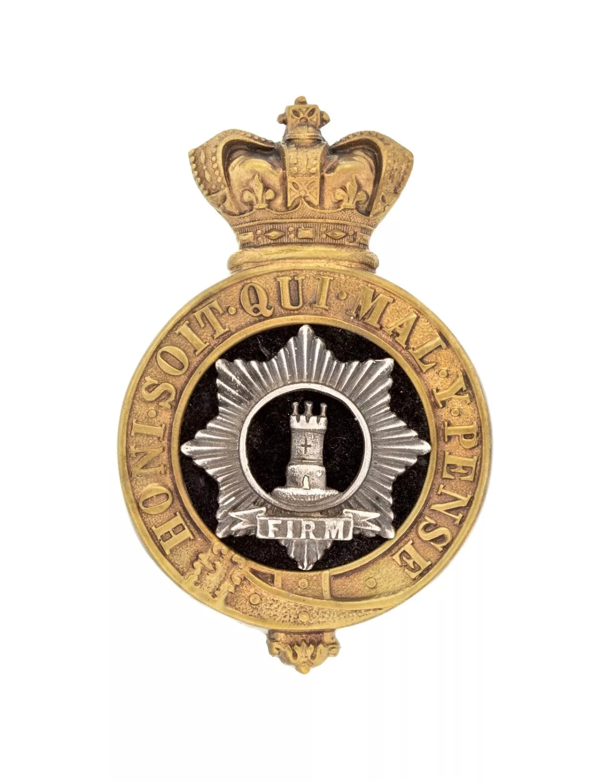 A strap inscribed HONI.SOIT.QUI.NAL.PENSE surmounted by a crown. In the centre on black velvet ground the castle with a scroll below inscribed FIRM.